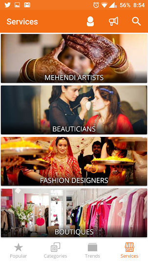You can obtain service for the following categories – Mehndi, Beautician, Fashion Designers, Boutiques, Decorators, Jewellery Design, Wedding Choreographer, Invitation Designers, Wedding Planners, Caterers, Gifts, Venues, and DJs. You can select your service over a handful of India cities with an optional parameter of adding your budget range.